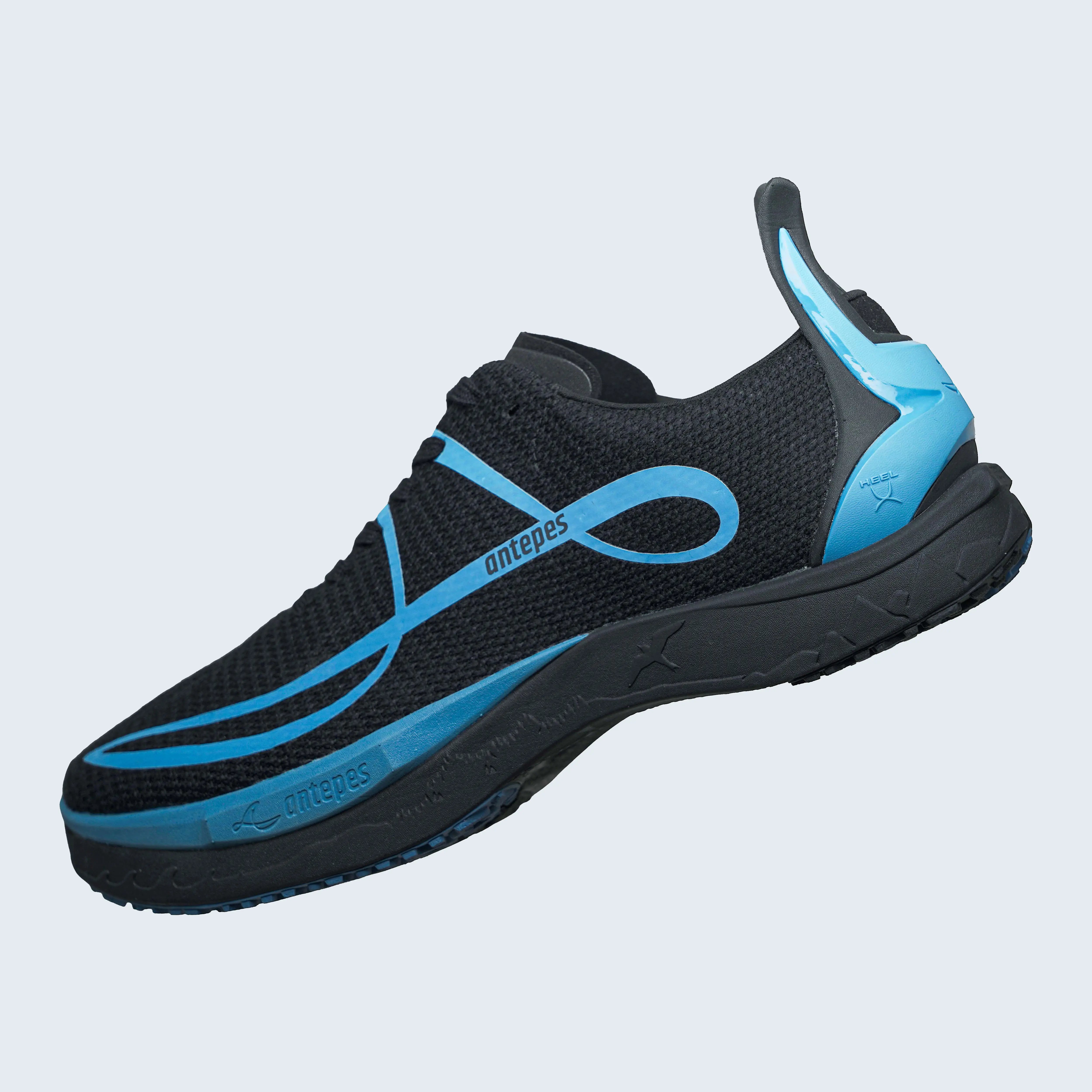 Antepes high-performance footwear double up as a rehabilitating tool for strengthening and elongating the fascia and muscles in the lower legs, such as the Achilles tendon and the Plantar fascia ligament, by loading and stretching those connective tissues through facilitating the ground impact being absorbed through the forefoot and allowing the body’s natural suspension system, i.e. the kinetic chain, to be activated at contact point and distribute the impact through the body’s musculature as opposed to the body’s joints, such as the ankle, knee and lower back. Antepes footwear boost a forefoot stack height that elevates the forefoot above the heel and into a dorsiflexion of between 10-15 degrees and allowing the ankle complex to enter its end-of range-of-motion and thereby work through its entire range-of-motion for maximizing muscle and tendon activation and building strength and elasticity over its entire operating bandwidth. The full length carbon fiber plate is curvature-form-fitted to the foot providing great arch support and helping pivot the wearer onto the ball of the foot and activating the arch’s musculature, including the plantar fascia.